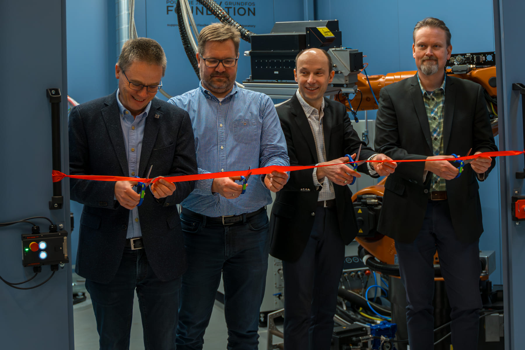 Cutting the ribbon together. From left: Head of Research Poul Toft Frederiksen, Grundfos Foundation, Head of Department Jens Christian Rauhe, Department of Materials and Production, Associate Professor Morten Kristiansen, Department of Materials and Production, and Jens Vestergaard Boll, Grundfos. Photo: Anders Fast Nielsen, AAU Communication and Public Affairs