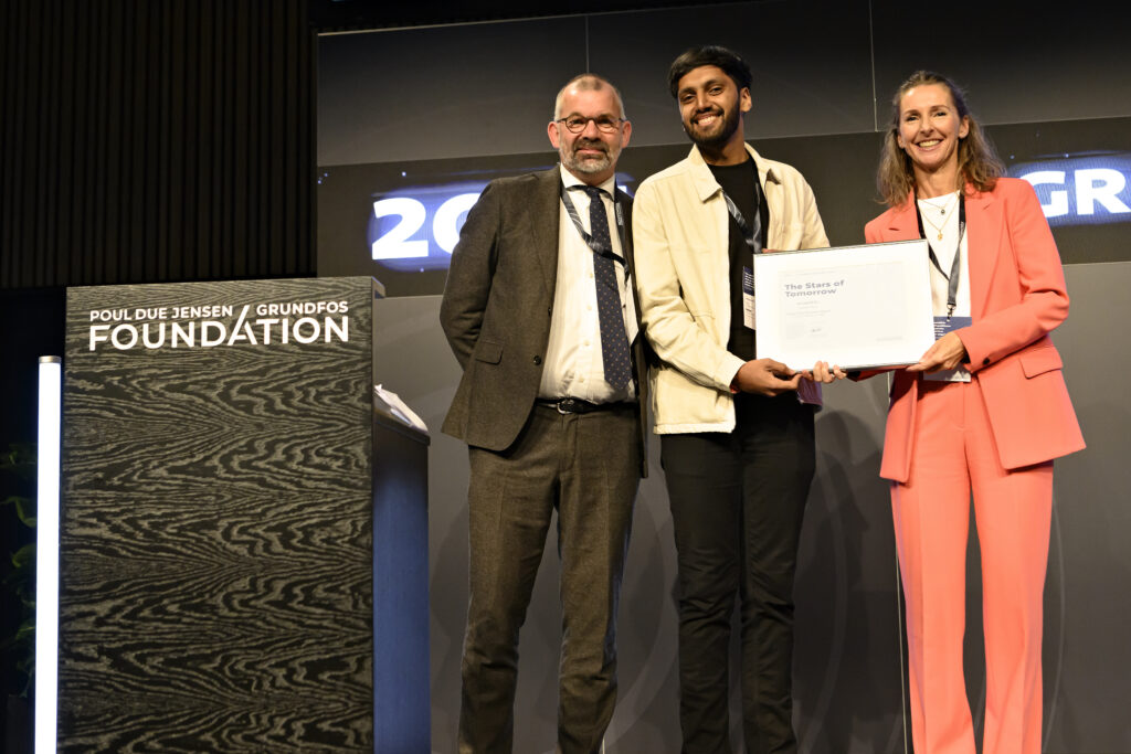 Jeswanth N L (i midten) blev kåret som bedste praktikant i 2024-2025. Grundfos CHRO Anne Grønbjerg (th) stod for prisoverrækkelsen med hjælp fra fondens administrerende direktør Kim Nøhr Skibsted (tv). Foto: Lars Holm
